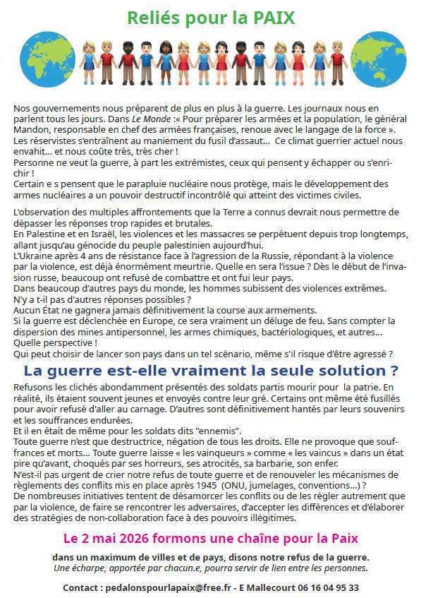 Contact : pedalonspourlapaix@free.fr