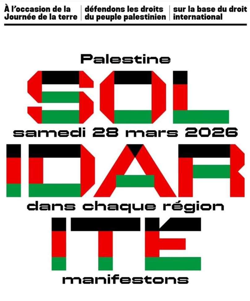 L’Association France Palestine Solidarité (AFPS) est à l’initiative de cette mobilisation, dans la continuité de la manifestation du 29 novembre 2025, qui avait réuni près de 50 000 personnes à Paris. Cette fois, l’objectif n’est pas de concentrer le rassemblement dans la capitale, mais de faire entendre la voix des Palestinien.nes dans chaque ville de France. Un rassemblement aura également lieu à Paris, le 28 mars à 14h, place de la République.