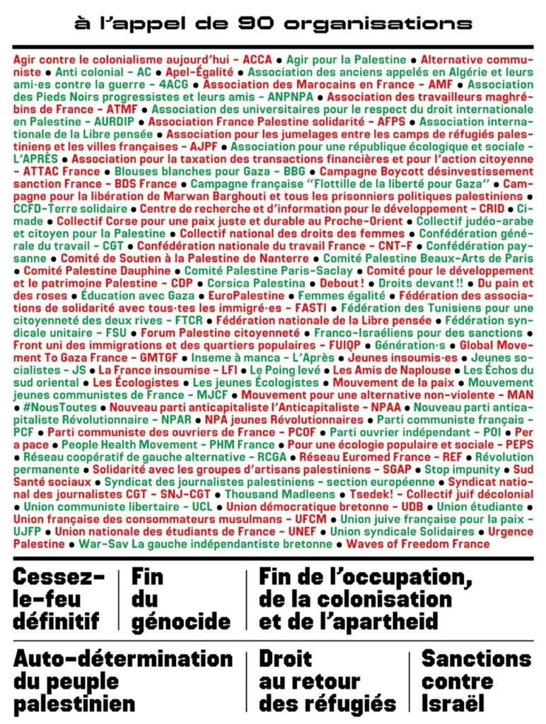 Plusieurs de nos partenaires en sont signataires, entre autres le Ccfd-Terre Solidaire et la Cimade, et nos amis de l’Union Juive Française pour la Paix (UJFP). Voir ci-dessous la liste complète des rendez-vous prévus et des 90 organisations signataires de l’appel.