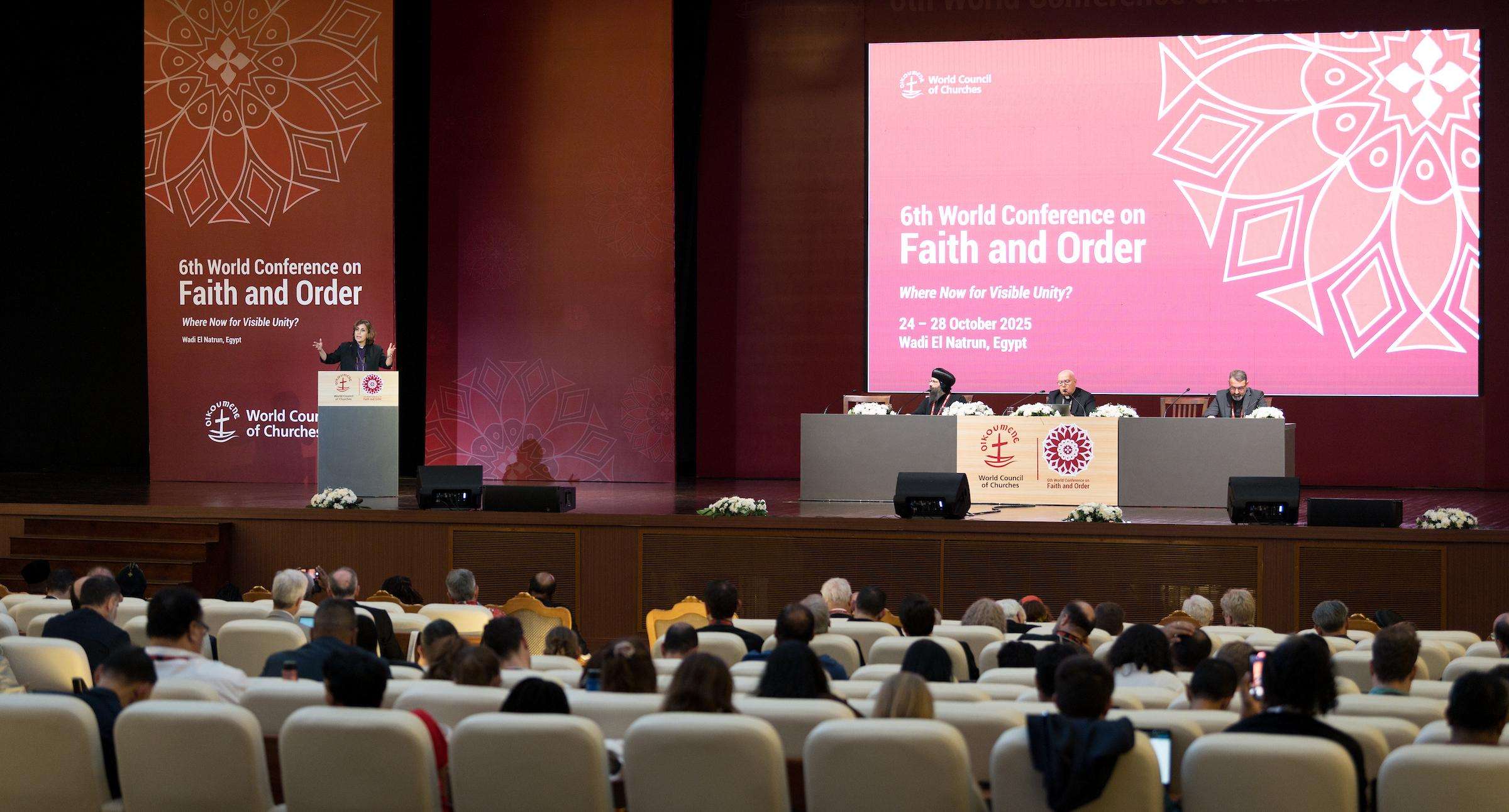 24 octobre 2025, Ouadi Natroun (Égypte). Son Excellence Anba Hermina, évêque général de l’Église copte orthodoxe, s’exprime lors d’une séance plénière sur la foi au Moyen-Orient, dans le cadre de la sixième Conférence mondiale de Foi et constitution du Conseil œcuménique des Églises, organisée du 24 au 28 octobre 2025 à Ouadi Natroun (Égypte), autour du thème : “Quels horizons pour l’unité visible?” Photo Albin Hillert/WCC